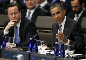 President Barack Obama, accompanied by British Prime Minister David Cameron, speaks during the meeting during the NATO Summit in Chicago.  (Photo by Carolyn Kaster / AP)