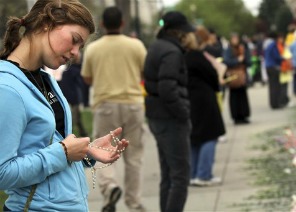 Amber Henry, 19, a student at Catholic University, prays during an event led by Christian faith organizations at the Supreme Court as the court’s debate continues on President Obama’s health care legislation, in Washington, D.C.
