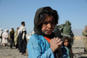 A young girl waits patiently to receive assistance during a visit to her village in Farah City, Afghanistan.