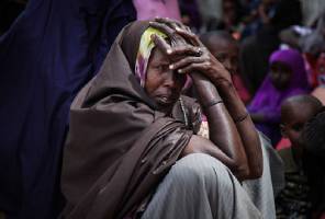 A woman waits in the shade of a derelict building to see a doctor at a free medical clinic in Kenya.