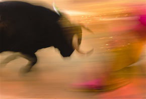 A bull charges during a bullfight at the Las Ventas Bullring in Madrid, Spain.  (Photo by Daniel Ochoa de Olza / AP)
