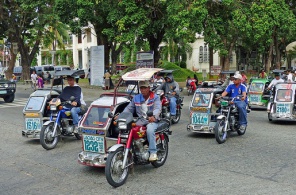 Motorized tricycles, the equivalent of rickshaws, in Ilocos, the Philippines. These tricycles — motorcycles with little roofed sidecars — are found in most cities and towns in the Philippines. Tricycle drivers wait around in front of malls, restaurants and hotels, where they can command higher fares that tourists are willing to pay.