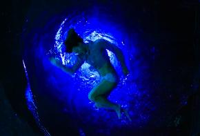 A performance artist of the show "Fuerzabruta" lays in a water basin during a photo-call in Berlin.