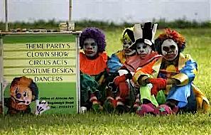 Clowns brought in to entertain children listen to U.S. First Lady Laura Bush address the crowds at the launch of Tanzania's national plan of action for orphans and vulnerable children in Dar Es Salaam, Tanzania.