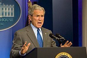 President Bush emphasizes an answer during a press conference at the White House in Washington, in this file photo. Bush will veto legislation banning waterboarding and other harsh interrogation tactics.