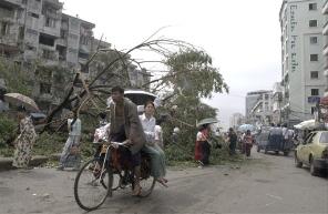 A bicycle taxi driver moves along through a damaged area of Yangon, Myanmar, following the cyclone Nargis.  (Photo by Barry Broman / AP)
