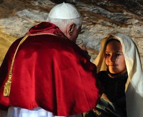 A girl dressed as Sainte Bernadette gives holy water to Pope Benedict XVI at the Grotto of the Apparitions in the Sanctuary of Lourdes, France.