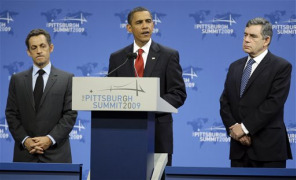 President Barack Obama, accompanied by French President Nicolas Sarkozy and British Prime Minister Gordon Brown, makes a statement on Iran's nuclear facility during the G-20 summit in Pittsburgh.