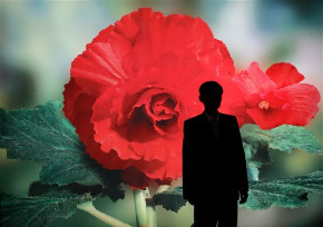 A man poses in front of a light box featuring a Kimjongilia during a flower show in Pyongyang, North Korea.  (Photo by Vincent Yu / AP)