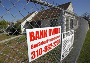 A vacant home surrounded by a chain link fence, carrying a "bank owned" sign and ads from local tradespeople, is seen in Los Angeles.
