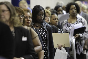 Unemployed job seekers including Lindsey Wright, of Detroit, center, attend a job fair in Southfield, Mich. Unemployment numbers went up to 9.6 percent in August according to the latest Labor Department report.