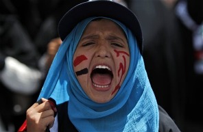 A female anti-government protestor shouts slogans during a demonstration demanding the resignation of Yemeni President Ali Abdullah Saleh, in Sanaa, Yemen. Arabic reads on her face, “Leave.”