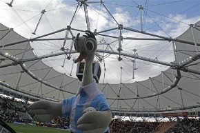 A mascot dressed in Argentina’s team colors is seen on the pitch before the start of their 2011 Copa America match against Venezuela in La Plata, Argentina