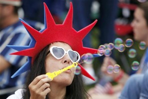 Christine Krupkowski, of Arlington, Mass., blows bubbles while waiting for the start of the Boston Pops 4th of July concert rehearsal at the Hatch Shell on the Esplanade in Boston.