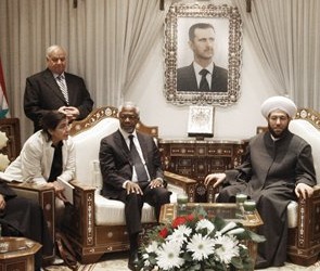 U.N. special envoy to Syria led by Kofi Annan, middle, meets with Ahmad Badr Al Din Hassoun, Syria’s Grand Mufti, far right.
