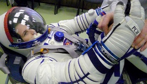 Italian astronaut Samantha Christoforetti with the European Space Agency has her pressurization checked in a Sokol suit.