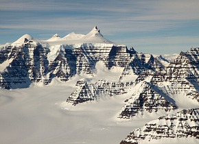 Mountain ridges showing the distinctive geology of the Geikie Plateau region in eastern Greenland, as seen from NASA’s P-3B aircraft.