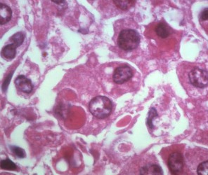 A photomicrograph of human liver tissue infected with Ebola virus. After 16 years, large-scale testing will begin for an Ebola vaccine.  (Photo by CDC / Dr. Fred Murphy)