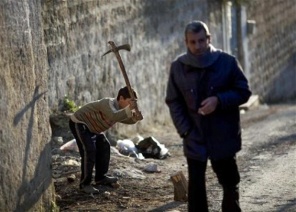 A man walks past a boy chopping wood to keep warm during an electricity cut in Idlib, Syria, in 2012.  (Photo by Freedom House) Photo used under CC BY