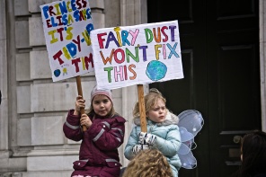 Children at the Global Climate Strike in London in March 2019. On March 15, 2019, school strikes, urging adults to take responsibility and stop the climate change, began taking place in over 2000 cities worldwide. Except for Antarctica, which has no schools, an estimated number of 1.4 million pupils from around the world participated in the events.