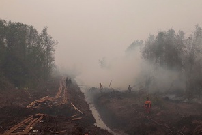 Firefighters battle peat-fed fires in Indonesia in 2015. Restoring peatland, rather than burning it, is currently one of Indonesia’s priorities to reduce its annual carbon emissions.  (Photo by NASA Earth Observatory) Photo used under CC BY