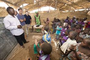 Army officials visit students inside a primary school in northern Cameroon in 2017. Armed separatists in areas of Cameroon have attacked, kidnapped and threatened hundreds of students in nearly five years of violence, depriving them of an education and forcing thousands to flee their homes.  (Photo by Sean Kimmons/U.S. Army) Photo used under CC BY