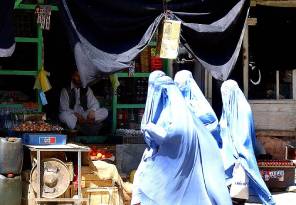 Women cross a market in Parwan Province, Afghanistan. Since the Taliban’s seizure of power, the country has plunged into unprecedented economic crisis. Many Afghan women are having trouble putting food on their tables.  (Photo by U.S. Federal Government) Photo used under CC BY