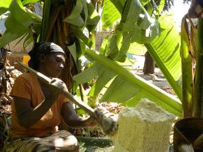 A woman extracts the edible part from an enset, the staple food crop in Ethiopia. Enset, or “false banana,” has the potential to feed more than 100 million people in Africa as the climate crisis worsens.