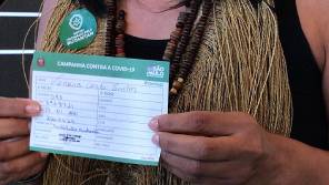 A woman in Sao Paolo, Brazil, displays her COVID-19 vaccination card. Vaccination rates in many Latin American countries, including Brazil, Cuba and Chile, are now outpacing countries in Europe and North America.