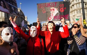 Several hundred protesters gather at Parliament Square in London as part of a worldwide series of protests in solidarity with Iranian women. At least 185 people have been killed during protests in Iran, according to Iran Human Rights.