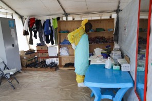 A Ugandan health worker dresses in protective clothing before treating a suspected Ebola case. A total of 36 Ebola cases, including 18 confirmed and 18 more listed as probable, had been reported, the Ugandan Ministry of Health Officials said; six of the confirmed cases were healthcare workers.  (Photo by Anna Dubuis / DFID) Photo used under CC BY