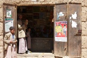 A child reads a UNICEF poster on a shop in Yemen. It informs him about the hazards of unexploded bombs, cluster munitions and mines, as well as how to avoid them. Women and children make up a significant proportion of those injured by landmines, according to the head of the Yemen Landmine Monitor.  (Photo by Julien Harneis) Photo used under CC BY