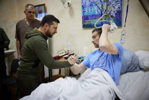 Ukraine President Volodymyr Zelenskyy pays a visit to the wounded defenders of Ukraine undergoing treatment at a military hospital.  (Photo by President Of Ukraine) Photo used under CC BY