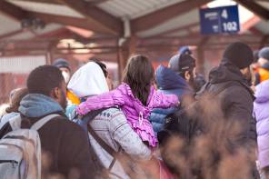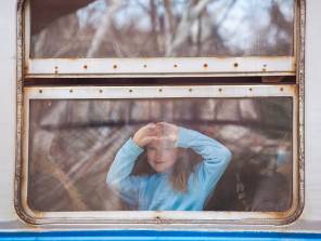 A young Ukrainian girl boards a train to flee to Poland. Just one week into the Russia-Ukraine conflict, more than 1 million people have fled Ukraine to neighboring European states.