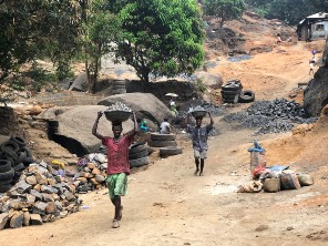 Two men work tirelessly at a stone mine in the western region of Sierra Leone. The West African country has a history of sometimes deadly conflict between local communities and foreign companies such as mining firms; locals have complained of environmental damage, losing their livelihoods and not being fairly compensated for their land.