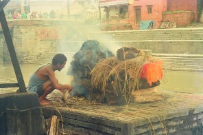 A man lights a cremation pyre by a temple complex along the Bagmati River in Kathmandu, Nepal. Families have long carried the bodies of deceased loved ones to these banks, washing their feet on a stone slab and sprinkling their faces with river water, as it is believed to wash away a person’s sins and send their soul to heaven before their physical remains are cremated atop heaps of wood and scattered into the waters.  (Photo by Dialog Center Images via Flickr (Creative Commons)) Photo used under CC BY