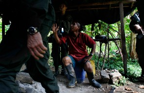 A Colombian coca farm worker speaks with police while other farmhands eradicate crops from the region. Since the 2016 peace deal between the left-wing guerilla group, Farc, and the government, right-wing paramilitaries and newer criminal gangs have been vying for territory in the power vacuum. A 2021 report by a Bogotá think tank claims at least 611 environmental defenders have been killed since the deal. Of these, 332 were Indigenous.  (Photo by William Fernando Martinez) Photo used under CC BY