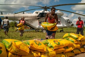 Local women help unload humanitarian aid from a World Food Program helicopter in Mozambique. Africa generates less than 3% of all greenhouse gas emissions, but experts say it is particularly vulnerable to climate change. Wealthy nations say they’ll do more to help African nations cope with climate shocks.