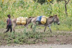 A boy uses donkeys to transport barrels of water in Tanzania. Of all regions, sub-Saharan Africa has the highest rates of education exclusion; 98 million children in the region are not in school, according to UNESCO, accounting for 40% of the total of out-of-school children worldwide.