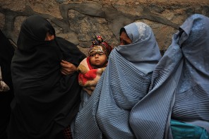 Internally displaced women wear head-to-toe burkas and no coats as they huddle together with a baby, waiting in the winter cold for aid in the Farah province of Afghanistan.
