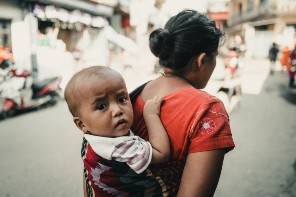 A mother walks with her baby swathed on her back in Nepal’s capital.  (Photo by Mondo79) Photo used under CC BY