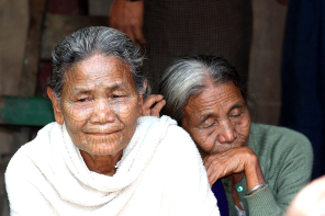 Two elderly women have spider webs tattooed on their faces, a tradition practiced by ethnic Chin in Myanmar.  (Photo by dany13) Photo used under CC BY