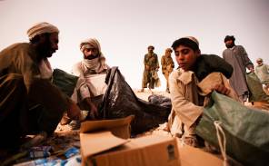 Afghan day laborers pick up trash as part of their duties.  (Photo by U.S. Marines) Photo used under CC BY