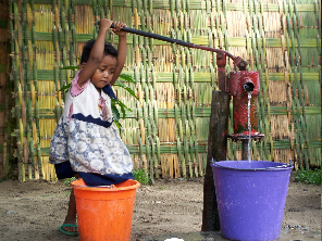 A young girl pumps water from a village well in Madagascar.  (Photo by Luc Legacy) Photo used under CC BY