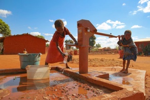 In Mjinchi, Malawi, children pump water from the village well.  (Photo by Melissa Cooperman/IFPRI) Photo used under CC BY