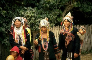 Akha women in Chiang Rai, Thailand. The teeth of the women are dyed red using a resin produced by an insect, collected on a Dispersés tree between Burma, China, Thailand and Laos.