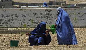 Two Afghan women water the soil at the Qalat Department of Women’s Affairs in 2011. The Taliban’s severe restrictions on what women are allowed to do have led to a decrease in support for the country from donors.