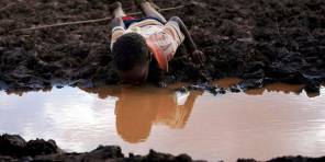 A young African boy drinks muddy water.  (Photo by Unknown) Photo used under CC BY