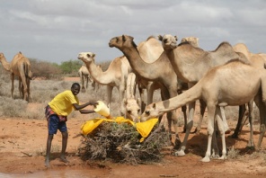A man waters his camels in a makeshift trough on the road from Wajir to Garissa, in northeast Kenya. Herders are taking advantage of the rains to water their livestock after a long period of drought.
