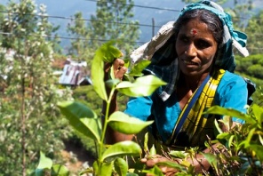 A tea picker selects leaves from the top of a tea plant in Nuwara Eliya, Sri Lanka.  (Photo by Pavel Dubrovsky) Photo used under CC BY